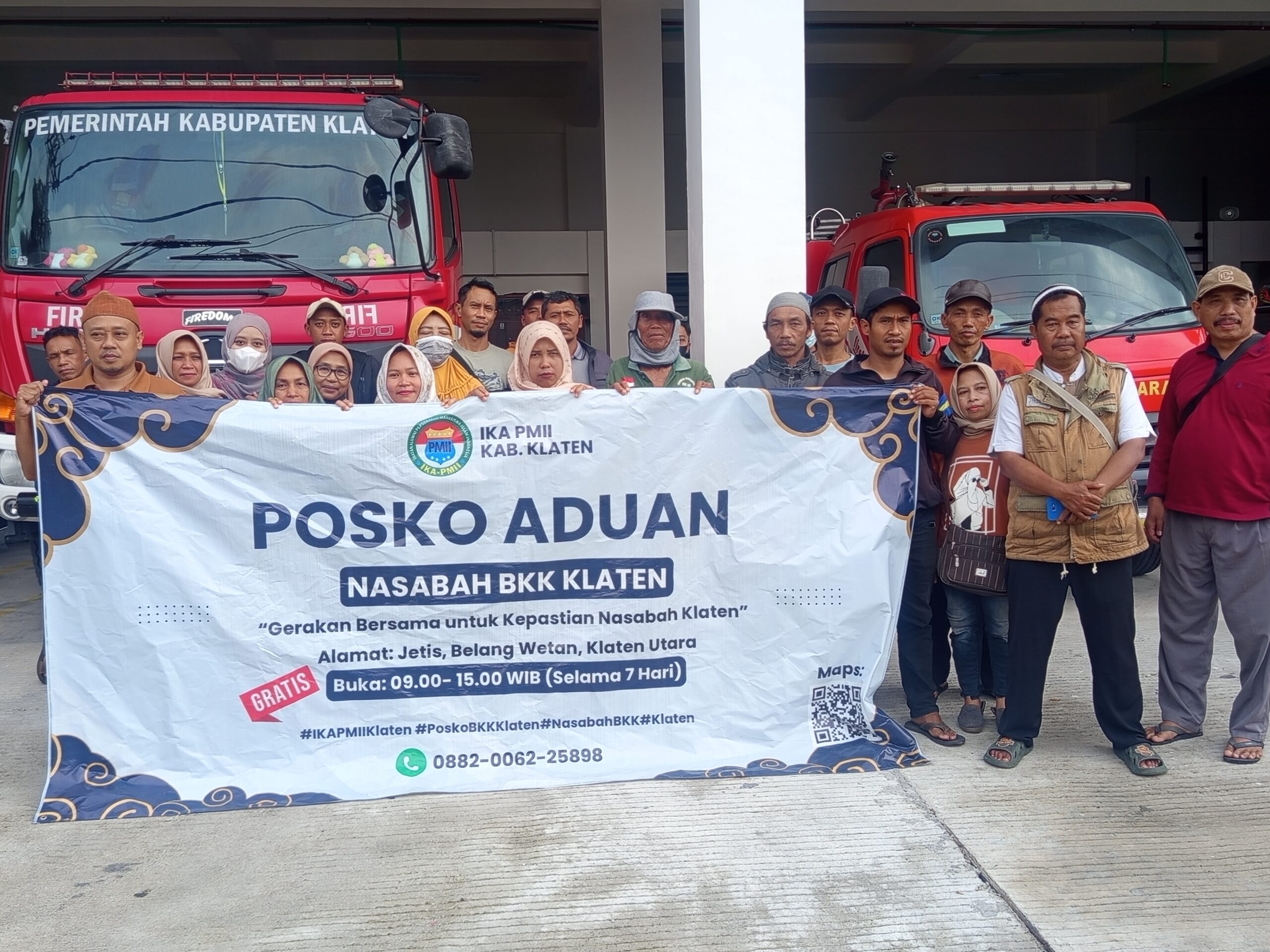 Didampingi Jojon, yang merupakan ketua IKA PMII Klaten mereka meminta tolong kepada DAMKAR supaya permasalahan mereka bisa sampai ke Presiden dan uang para nasabah bisa dicairkan.