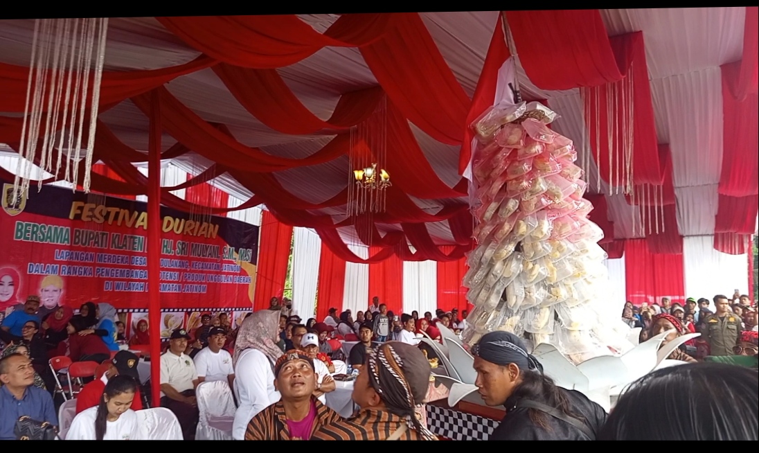 Gunungan yang yang berisikan durian kemudian di arak dinaikkan keatas panggung untuk dibagikan kepada warga masyarakat . Hadir dalam kegiatan tersebut Bupati Klaten Sri Mulyani S.M.M.Si yang memimpin acara dan membagikan gunungan durian kepada pengunjung yang sudah sedari tadi menunggu moment tersebut.
