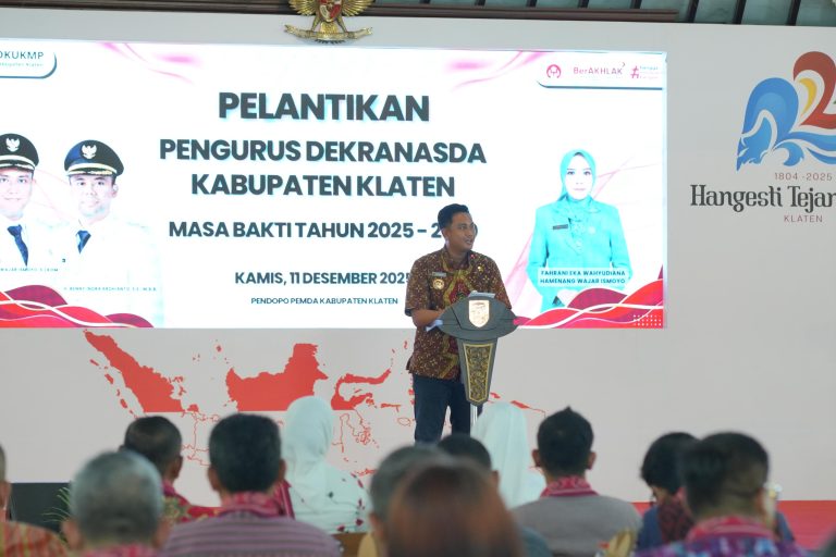 Lintasklaten.com – KLATEN – Pelantikan Pengurus Dewan Kerajinan Nasional Daerah (Dekranasda) Kabupaten Klaten periode 2025–2030 digelar pada Kamis (11/12/2025). Melalui pelantikan ini, Pemerintah Kabupaten Klaten berharap peningkatan daya saing UMKM dapat semakin terdorong.